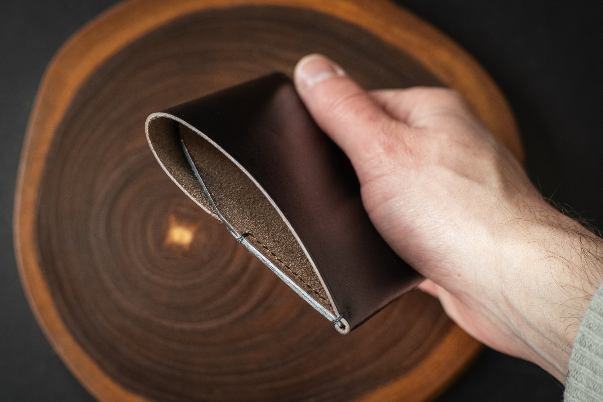 This particular wallet is made from black Horween Chromexcel Horsefront. It features a tight grain pattern and natural colored edges, with minor surface irregularities that serve as a reminder of the natural source of this product.