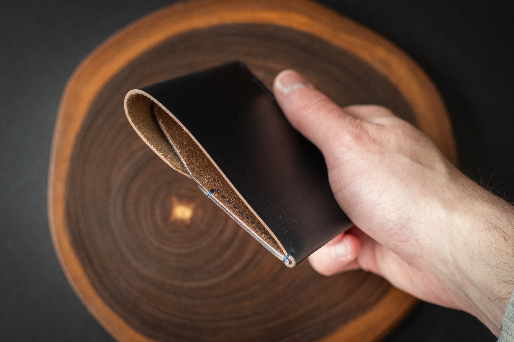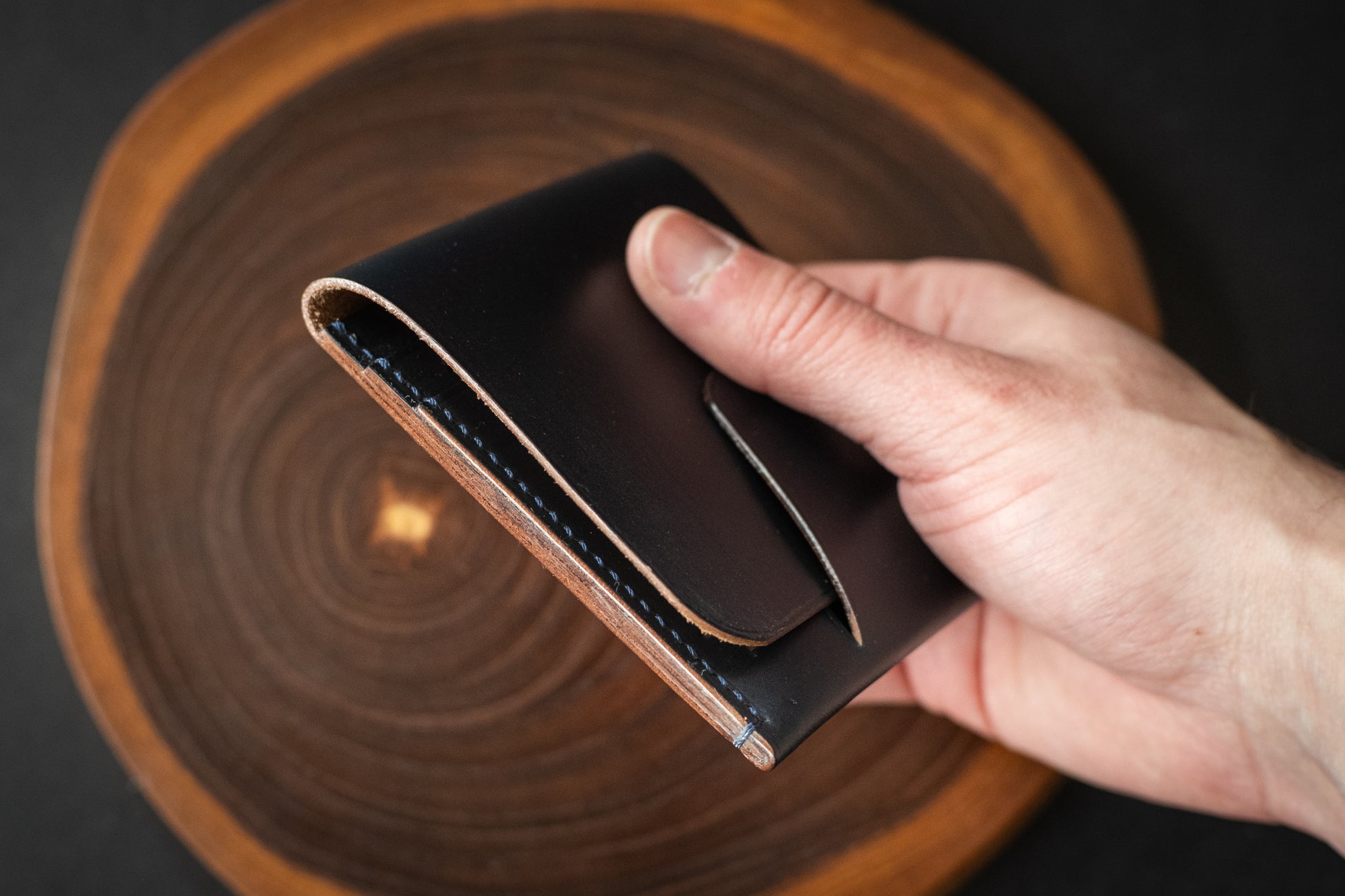 This particular wallet is made from blue Horween Chromexcel Horsefront. It features a tight grain pattern and natural colored edges, with minor surface irregularities that serve as a reminder of the natural source of this product.