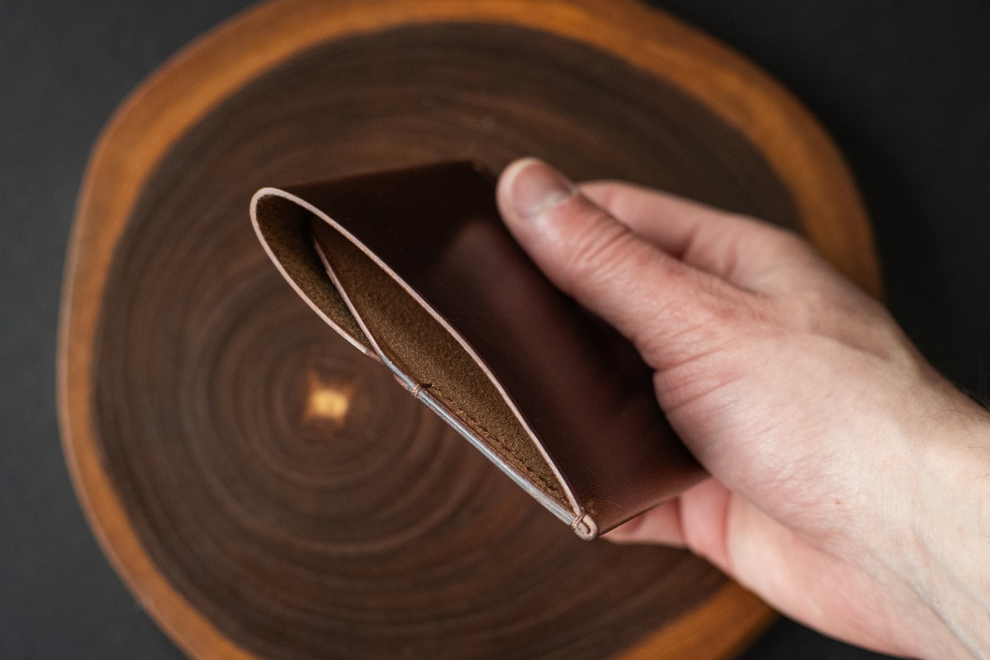 This particular wallet is made from deep brown Horween Chromexcel. It features a tight grain pattern and natural colored edges, with minor surface irregularities that serve as a reminder of the natural source of this product.