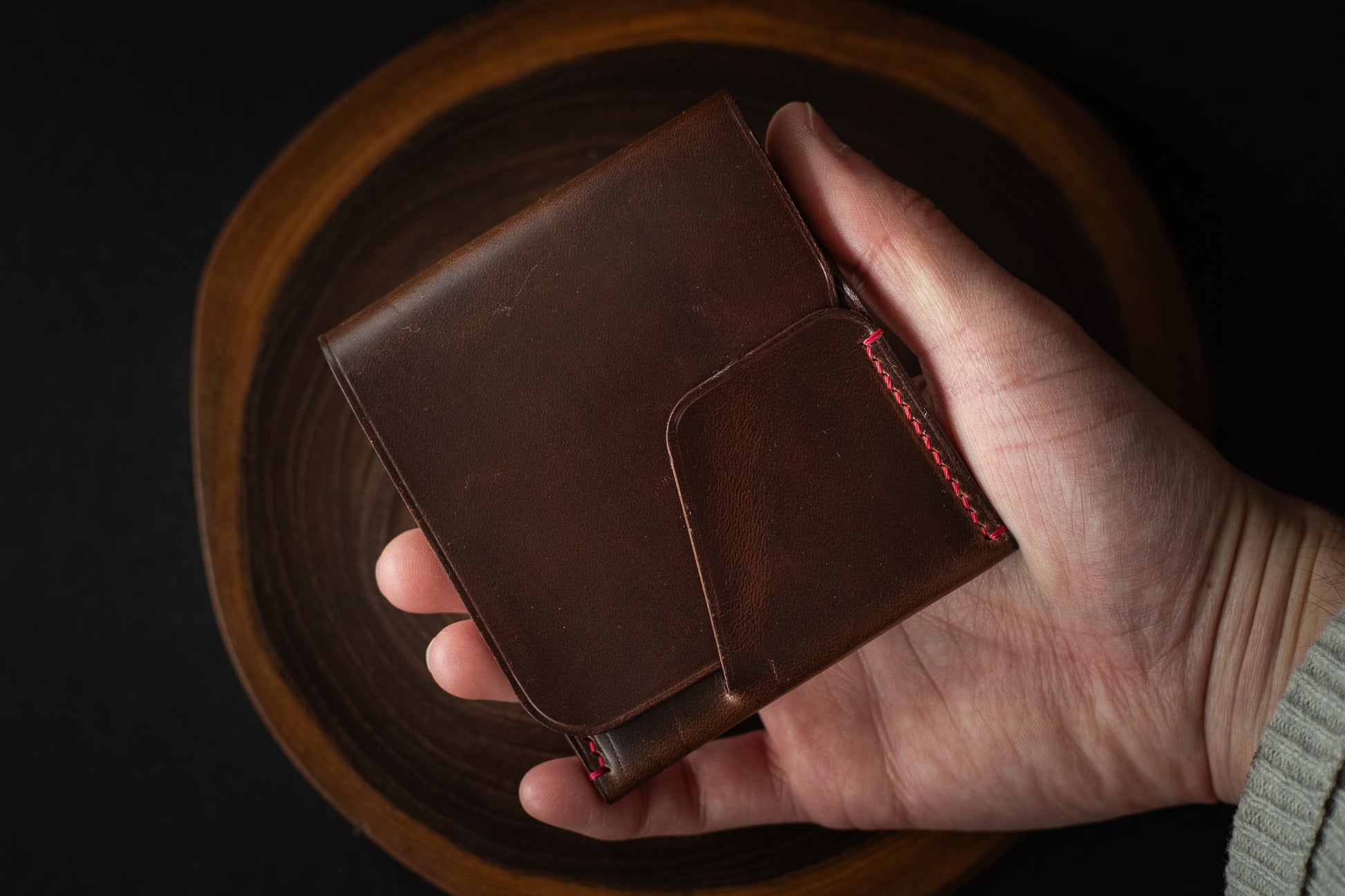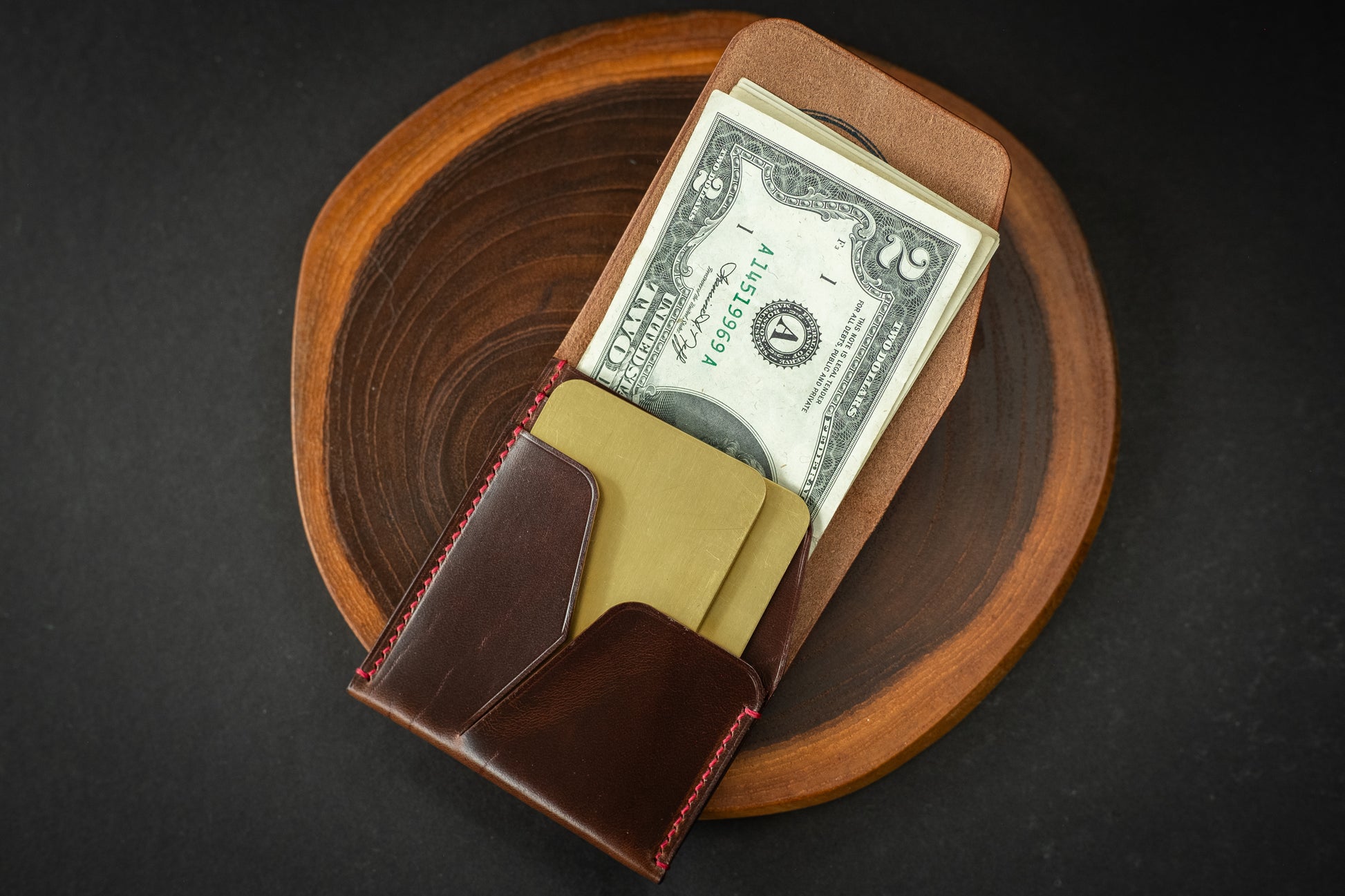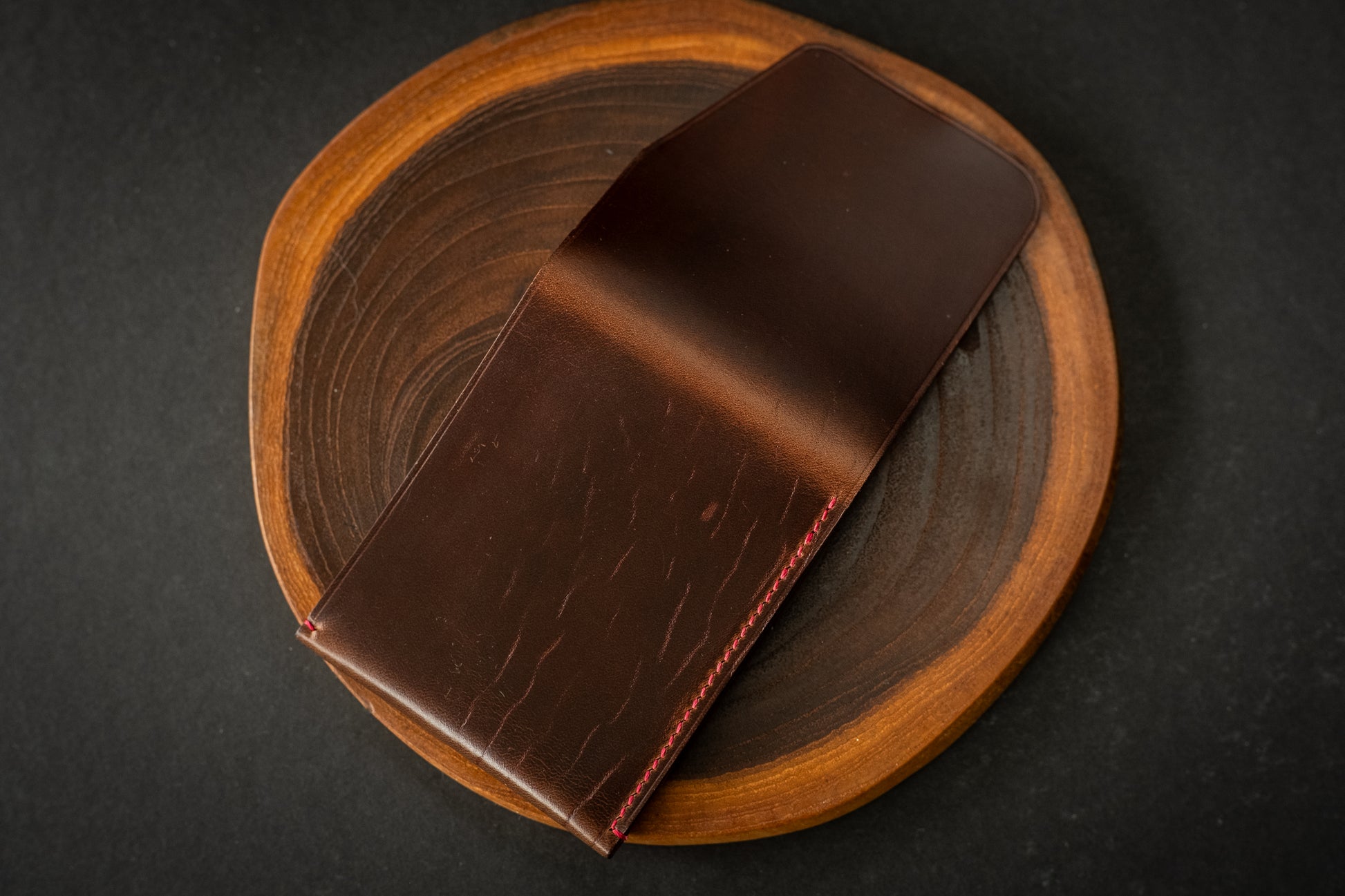 This particular wallet is made from deep brown Horween Chromexcel. It features a tight grain pattern and natural colored edges, with minor surface irregularities that serve as a reminder of the natural source of this product.