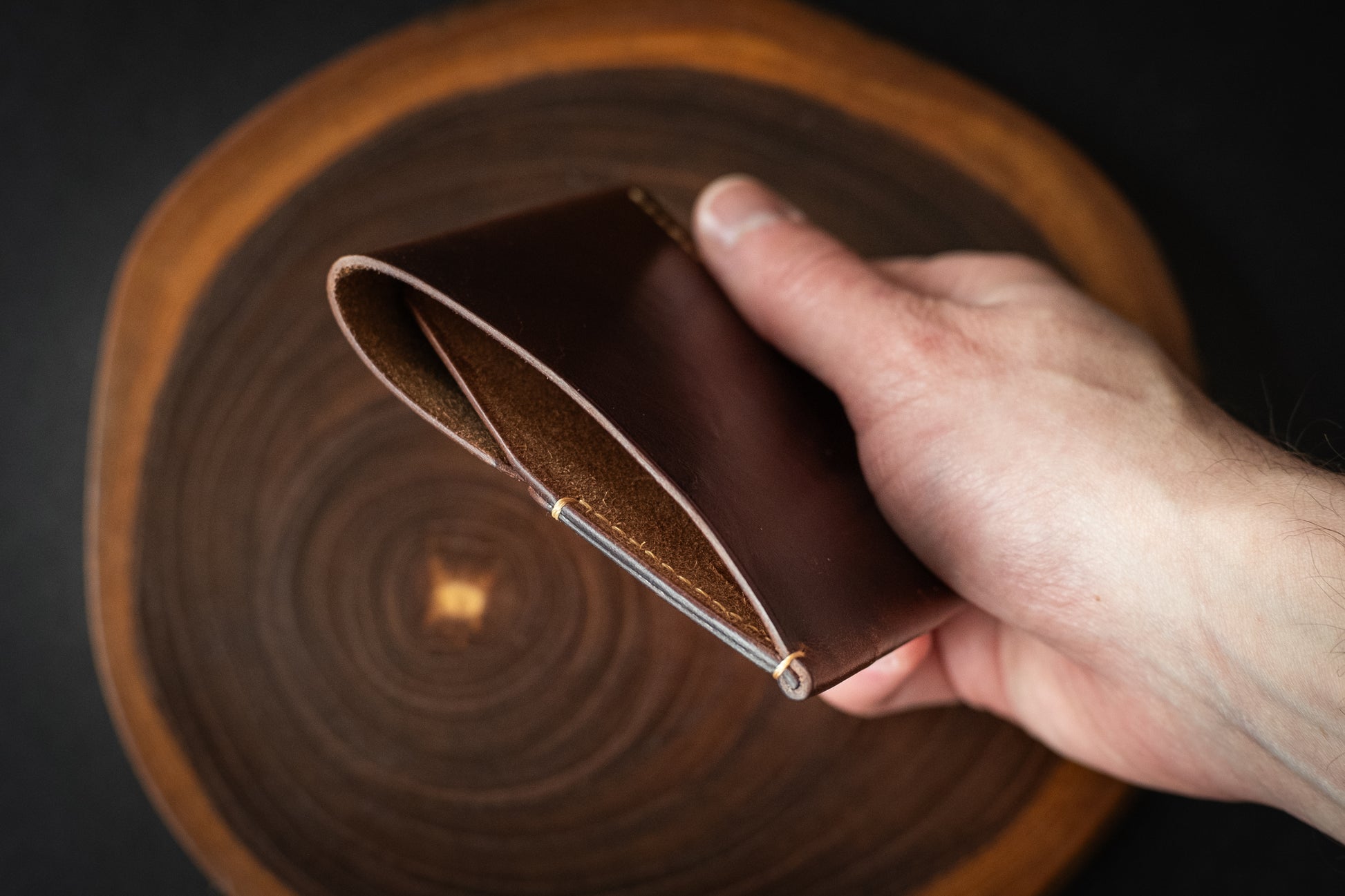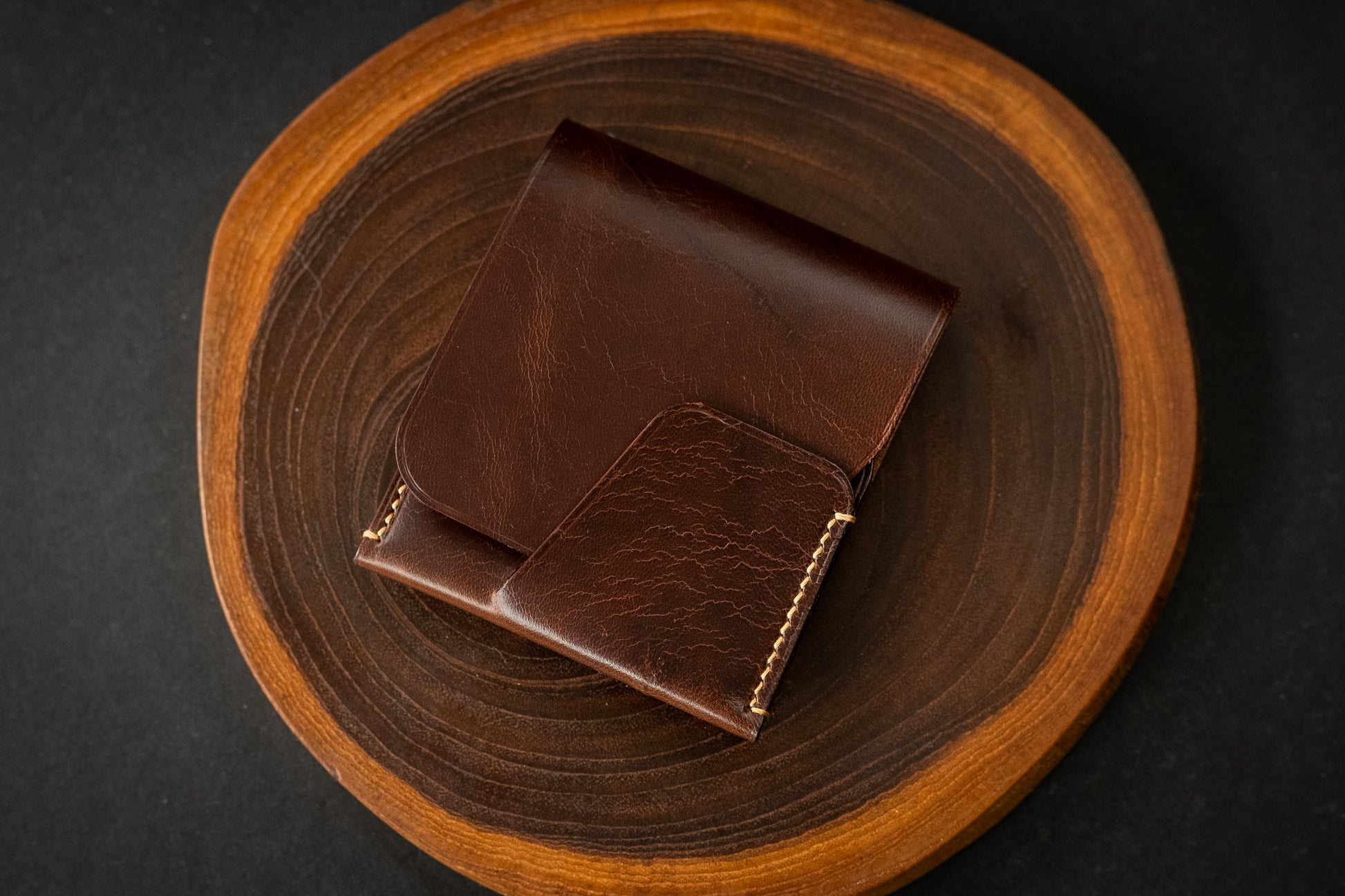 This particular wallet is made from deep brown Horween Chromexcel. It features a tight grain pattern and natural colored edges, with minor surface irregularities that serve as a reminder of the natural source of this product.