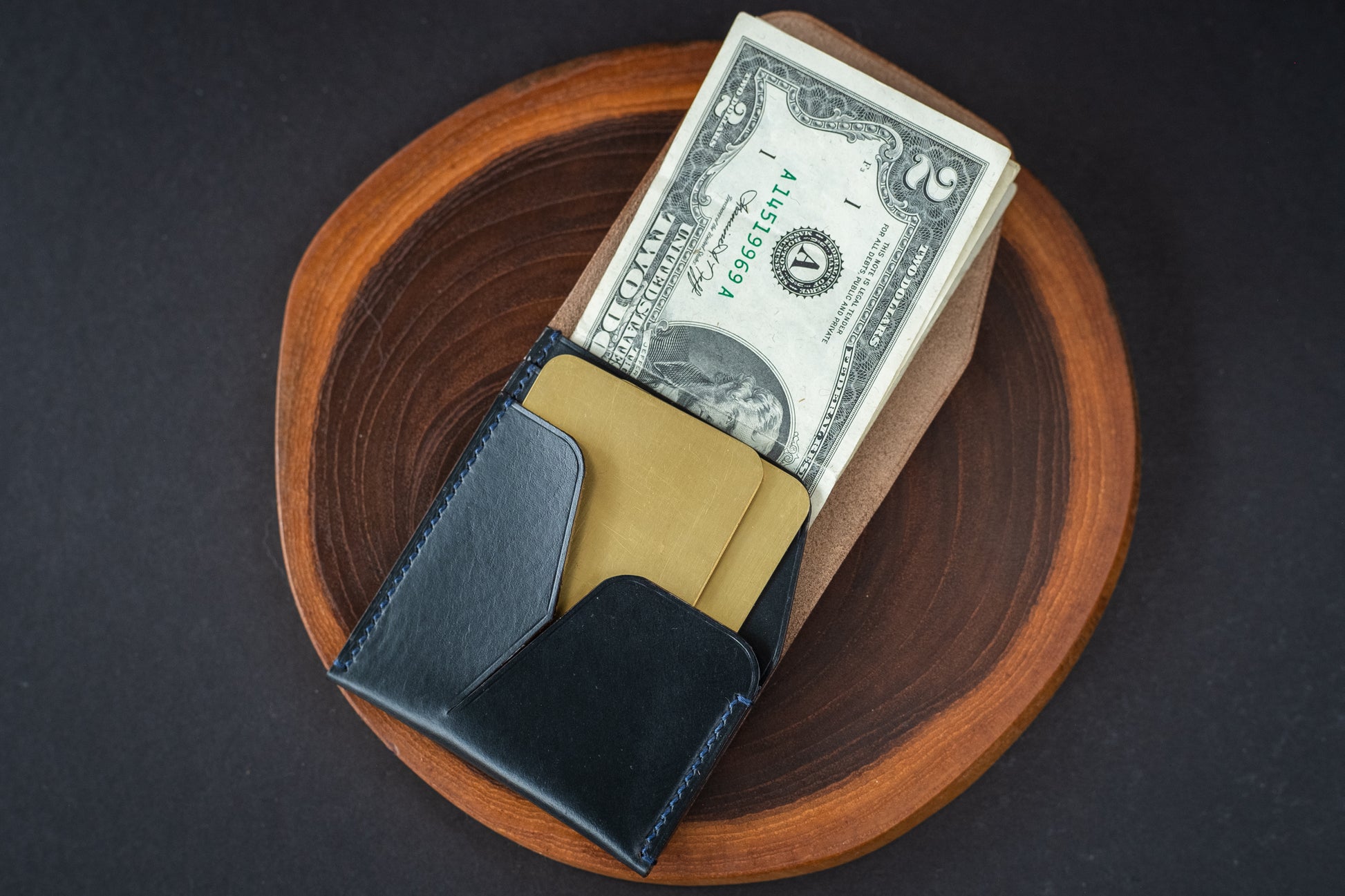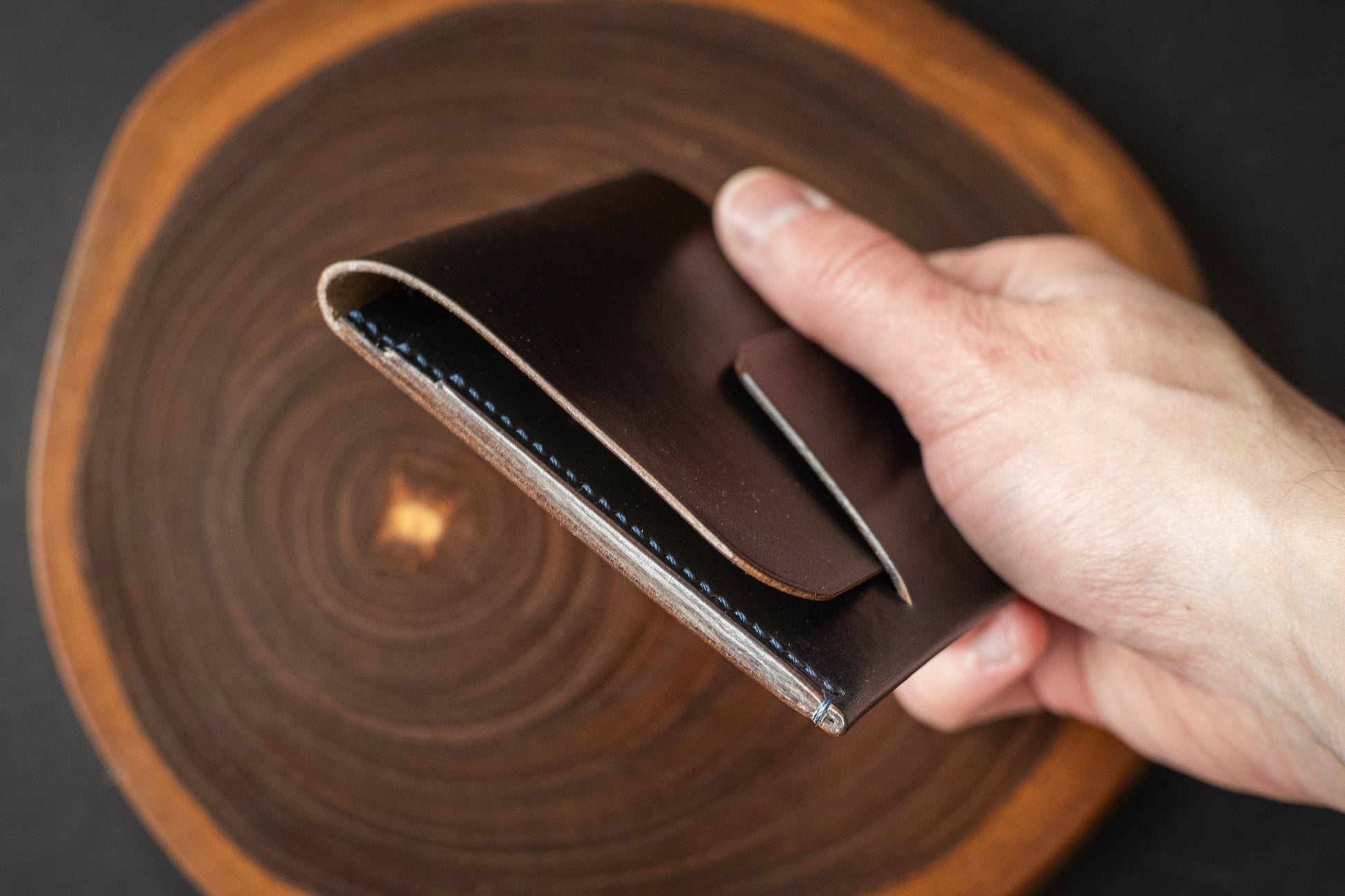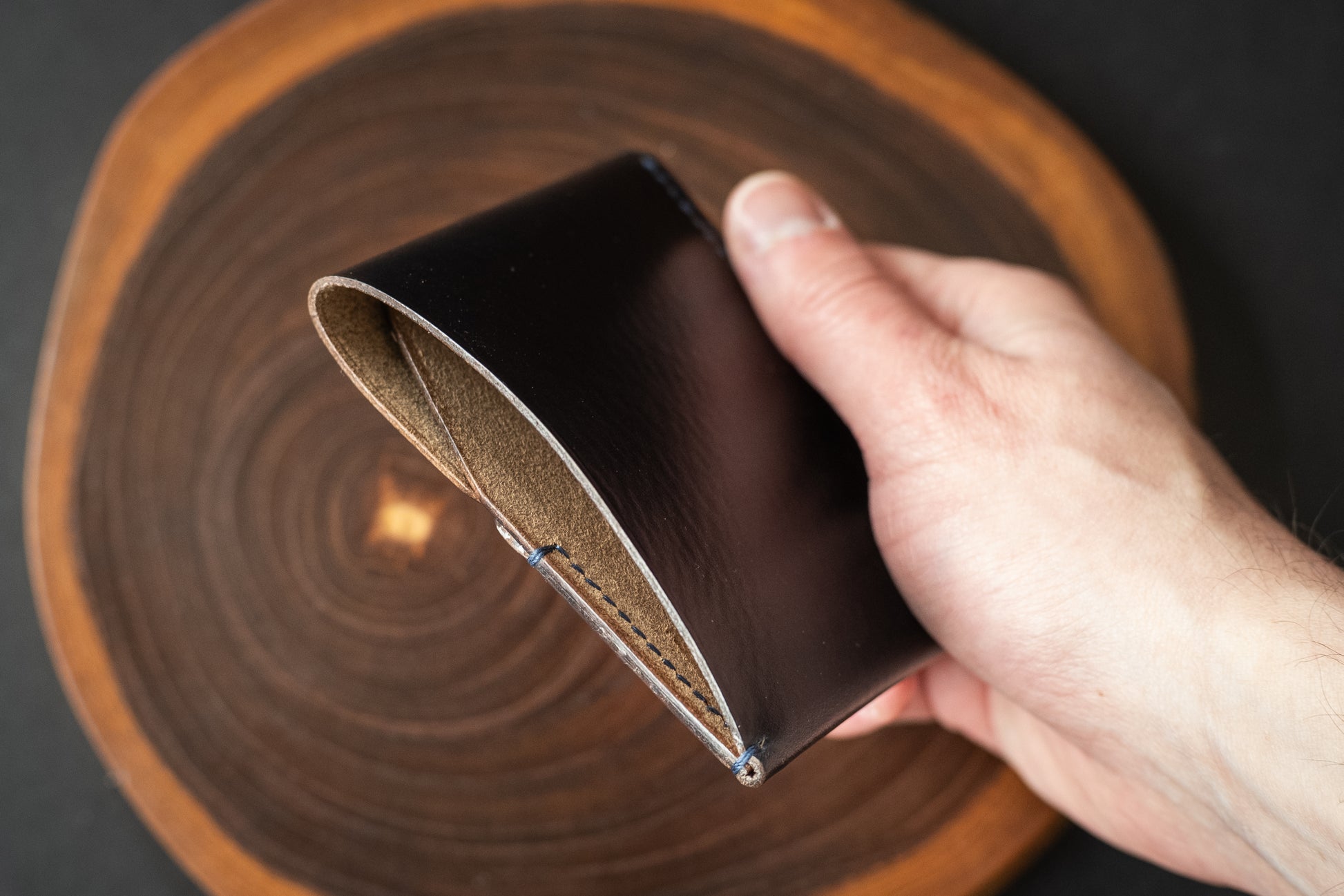 This particular wallet is made from navy blue Horween Chromexcel. It features a tight grain pattern and natural colored edges, with minor surface irregularities that serve as a reminder of the natural source of this product.