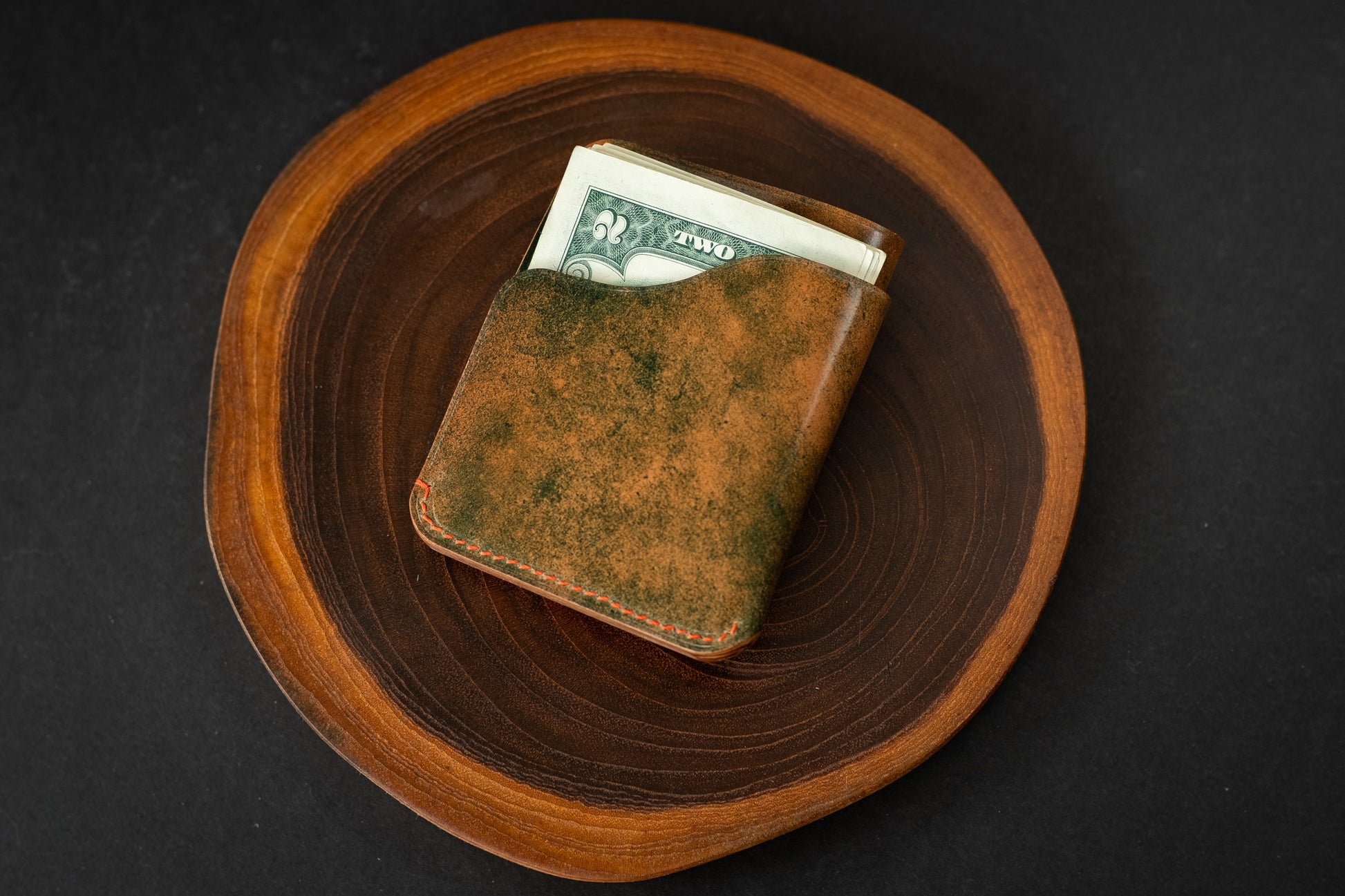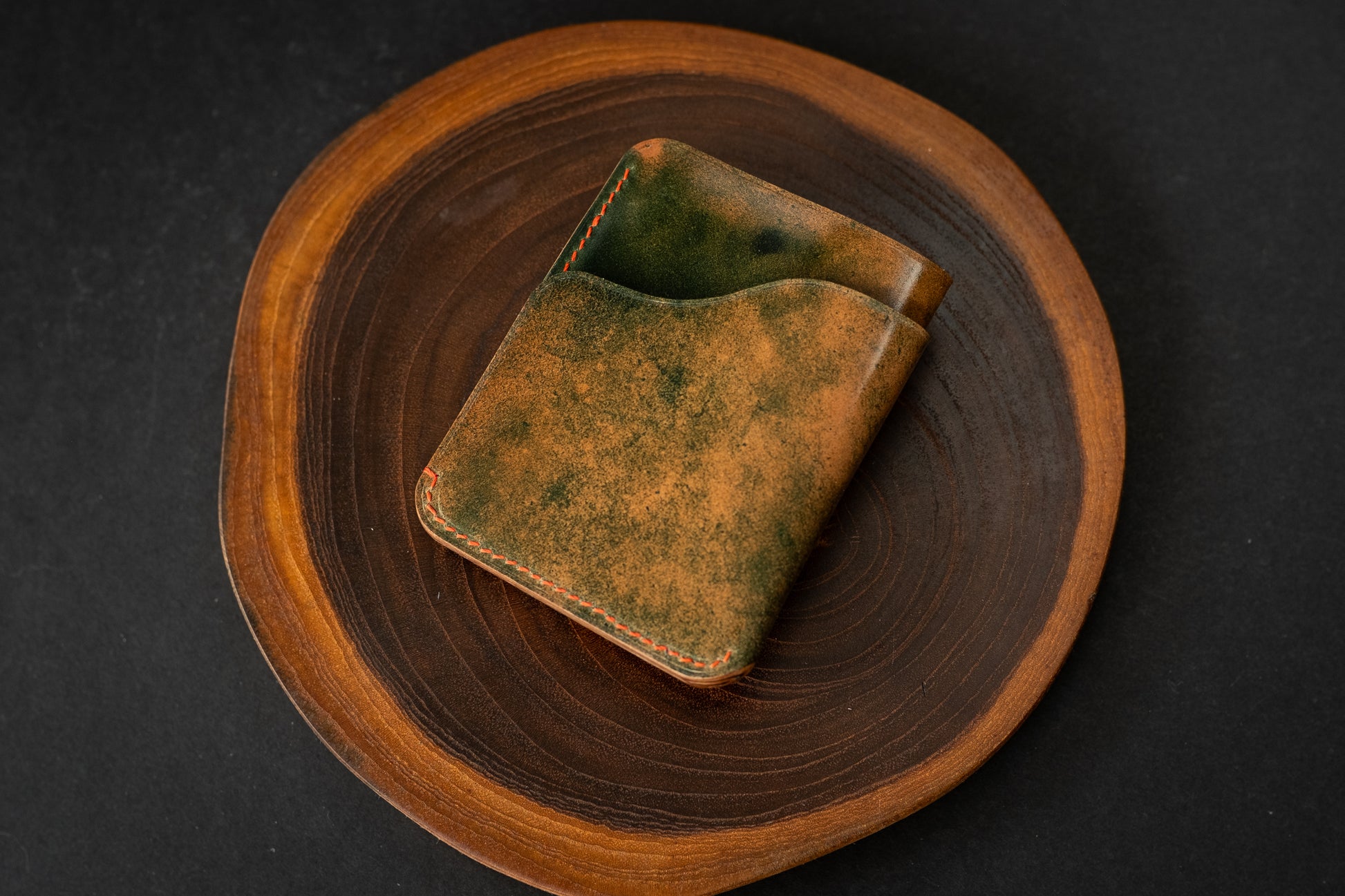 This particular wallet makes use of beautifully marbled Rocado shell cordovan. A single card slot is turned to the reverse to showcase the marvelous pattern on the back of the leather.