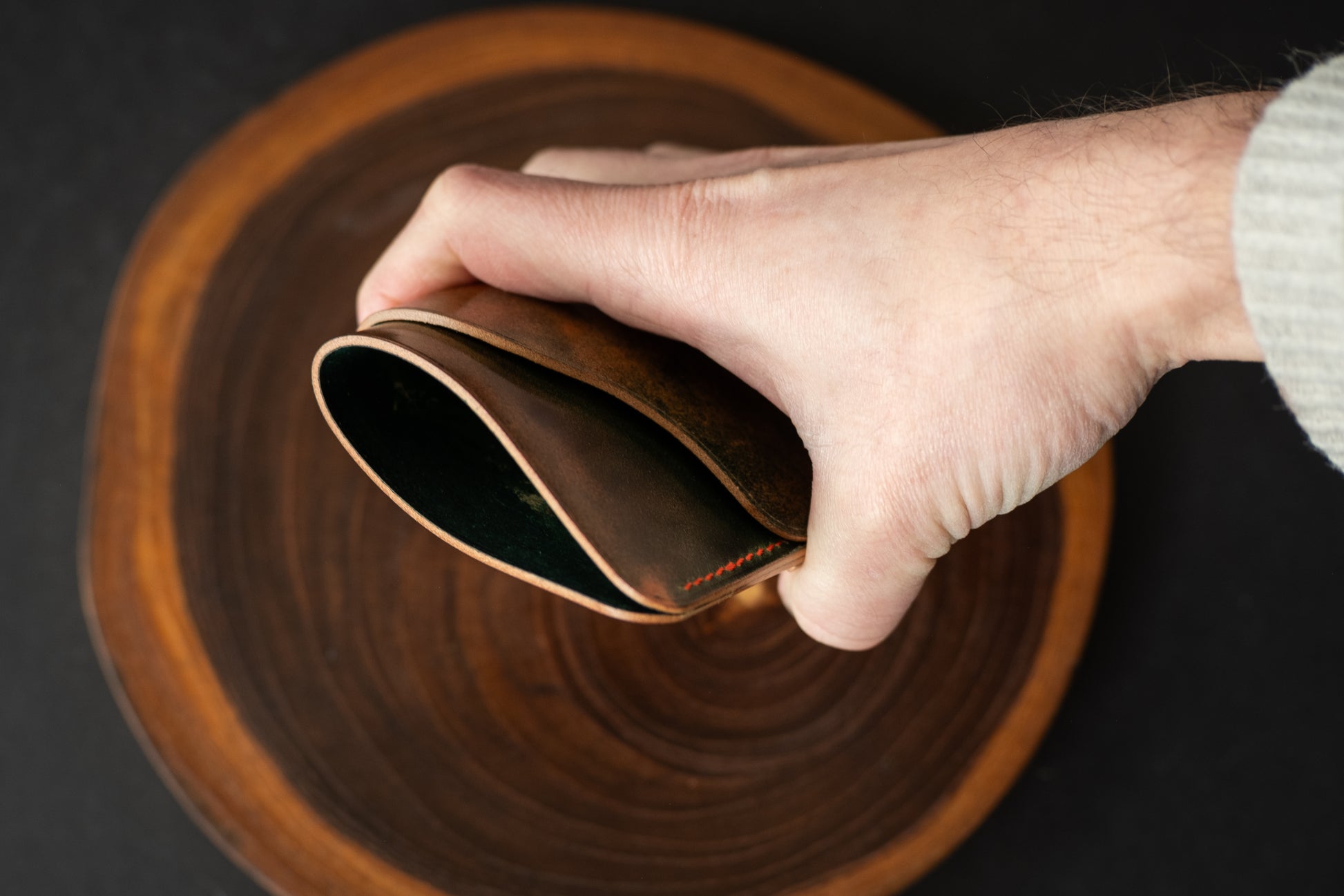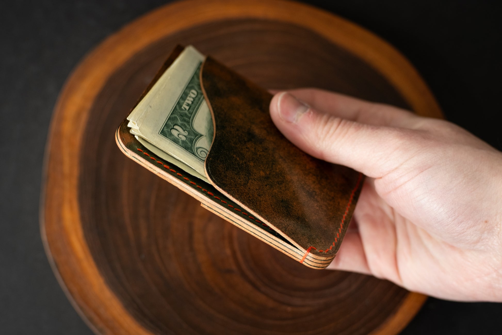 The layout is straightforward: two card slots, an open center section for overflow storage, and a rear flap designed to hold folded cash securely in place. It carries what’s needed and keeps bulk to a minimum.