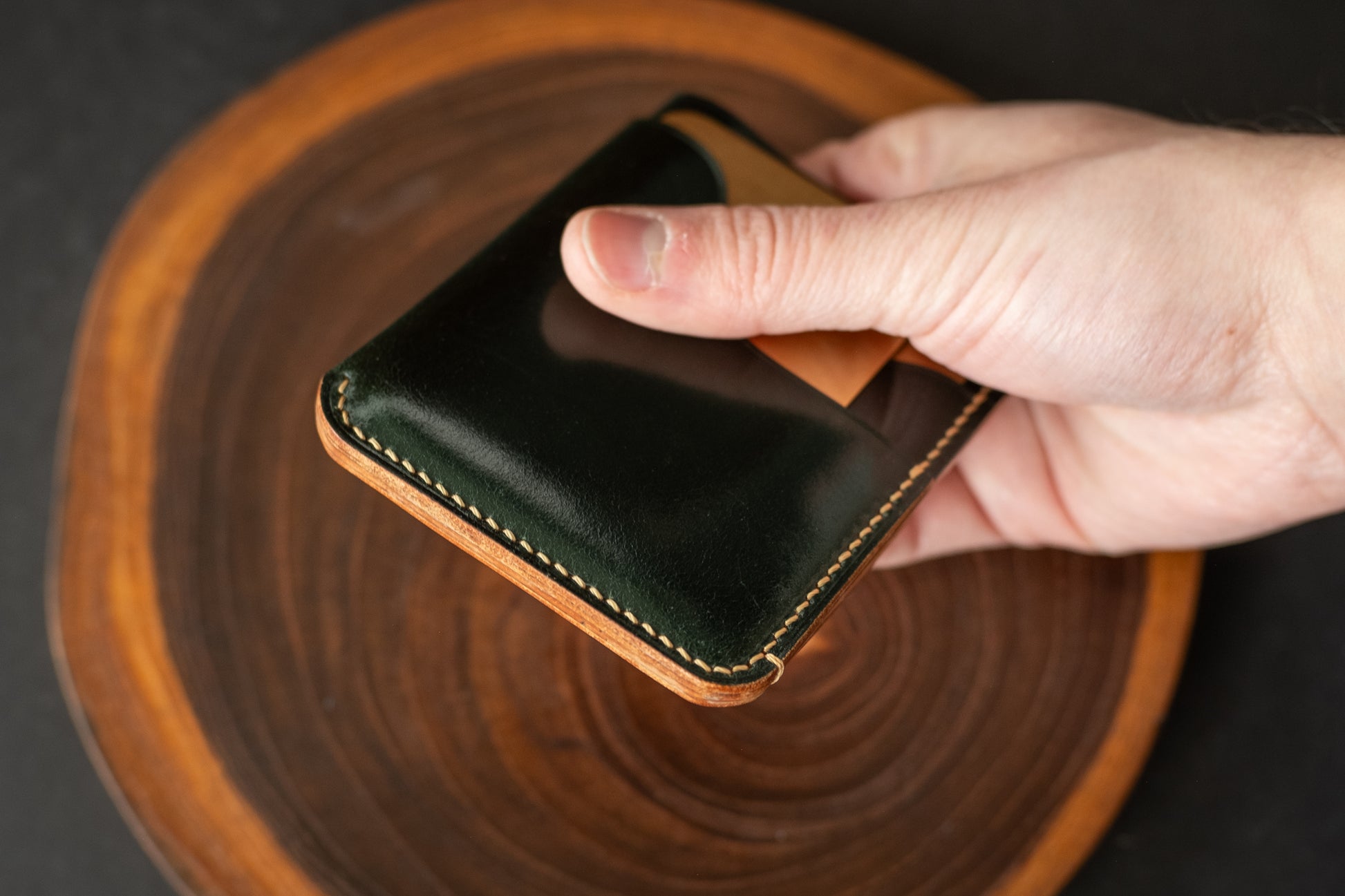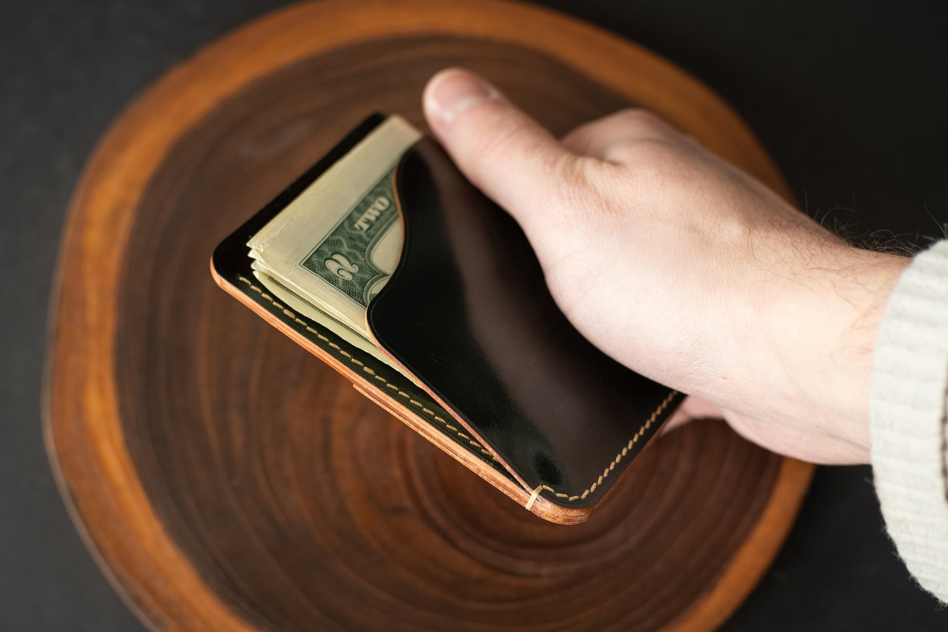 This particular wallet makes use of beautifully deep Rocado shell cordovan.