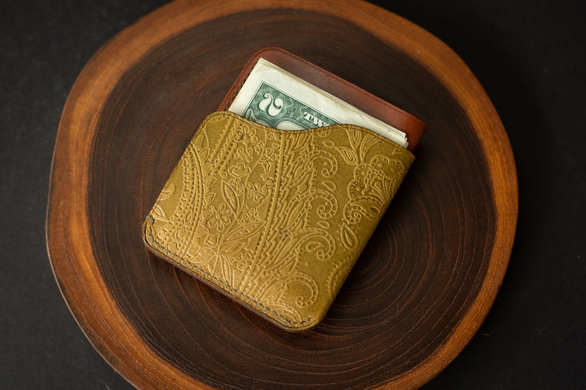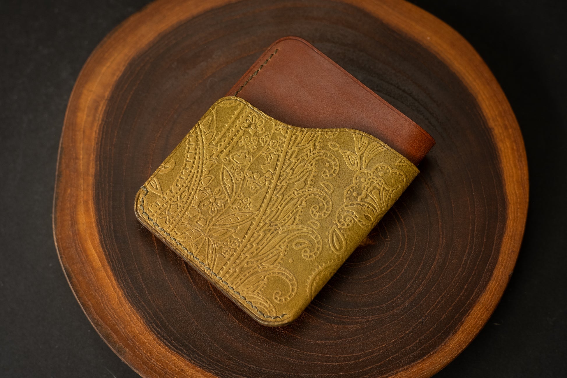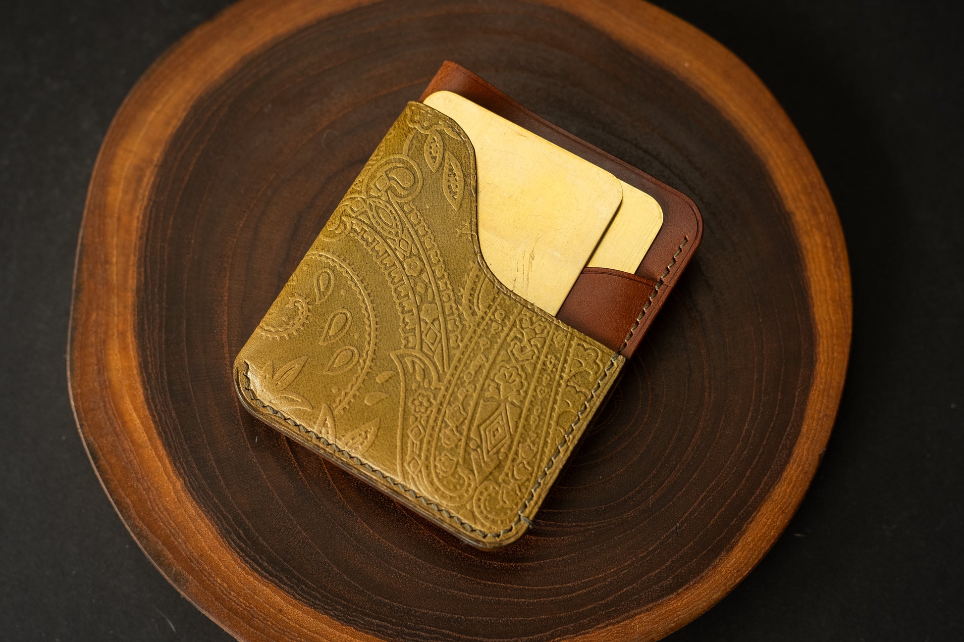 This particular wallet features olive printed Pecos leather paired with Whiskey Buttero, a perfect mix of two Italian leathers.