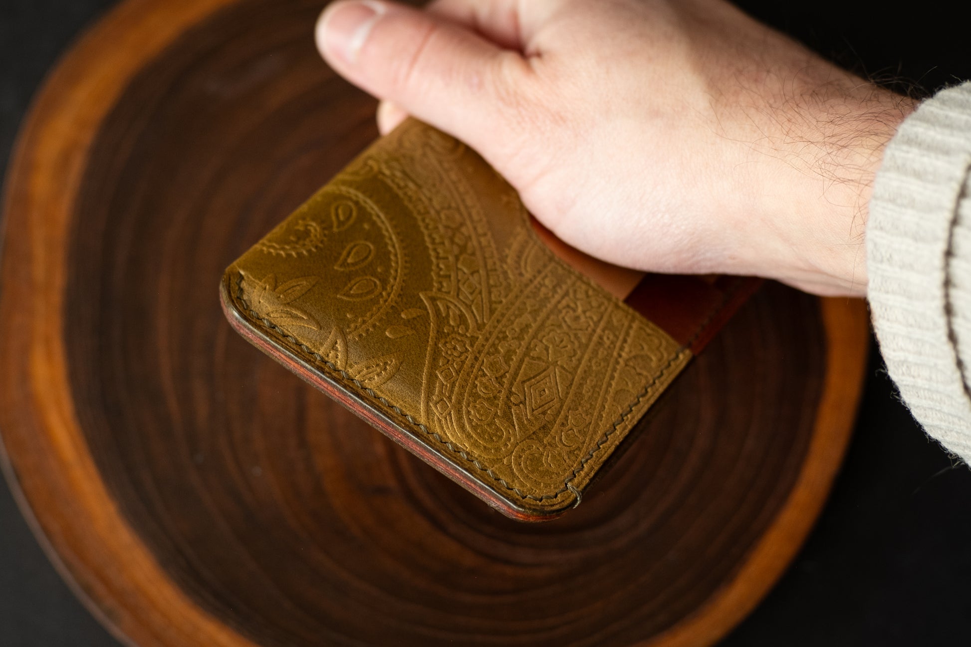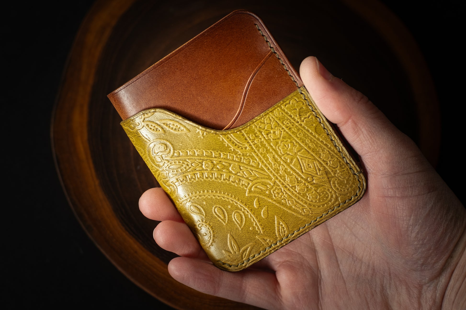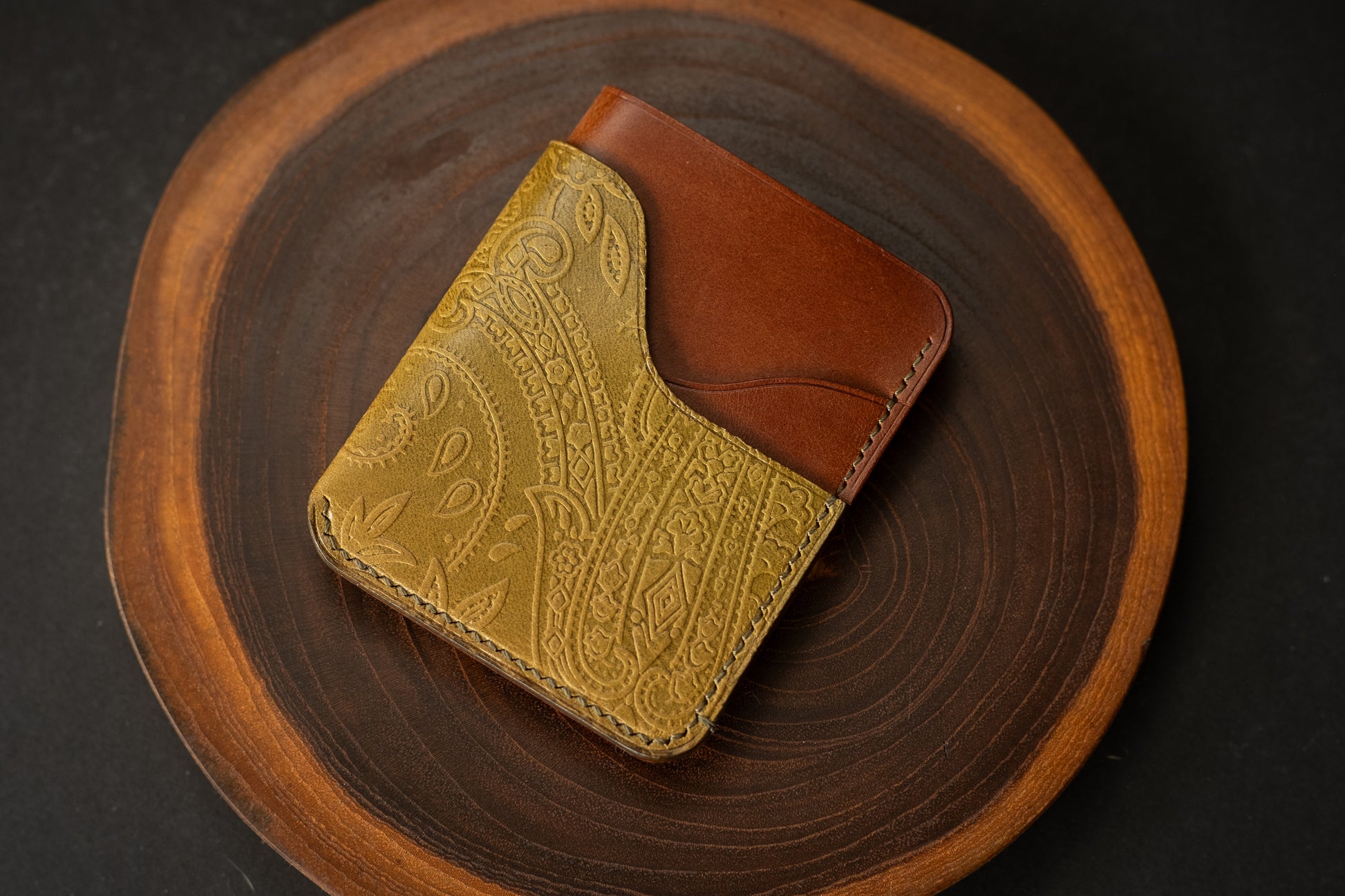 This particular wallet features olive printed Pecos leather paired with Whiskey Buttero, a perfect mix of two Italian leathers.