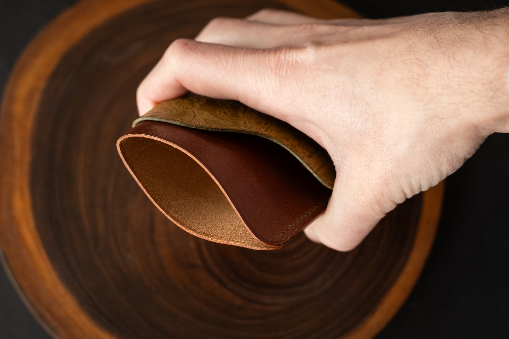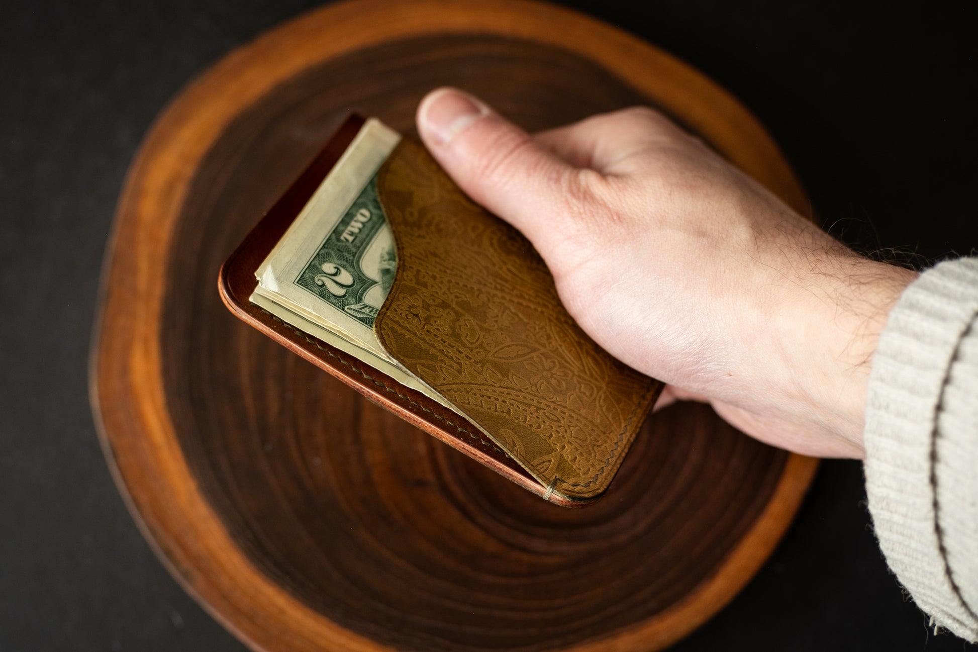 The layout is straightforward: two card slots, an open center section for overflow storage, and a rear flap designed to hold folded cash securely in place. It carries what’s needed and keeps bulk to a minimum.