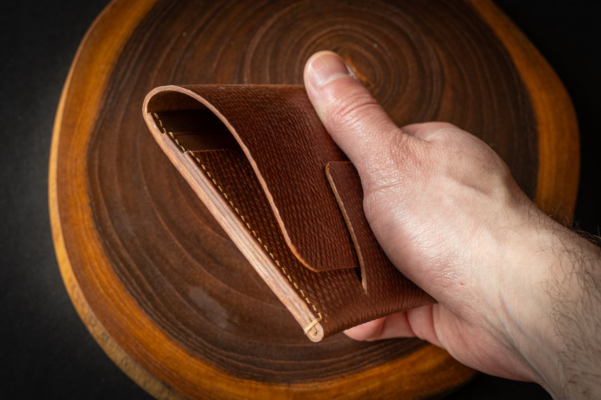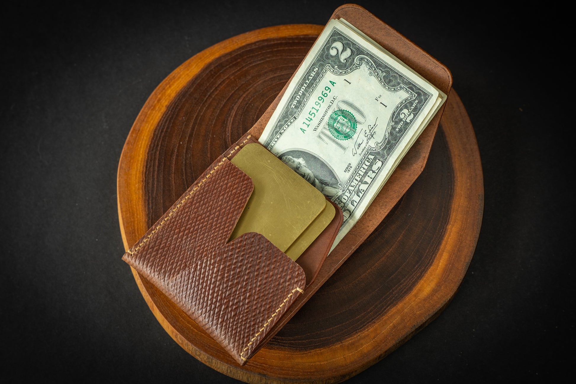 A single piece of leather forms the body of the wallet, consisting of the back, flap, and the front card slot and closure. Two additional pockets inside give some additional divider space to separate your cards and bills.